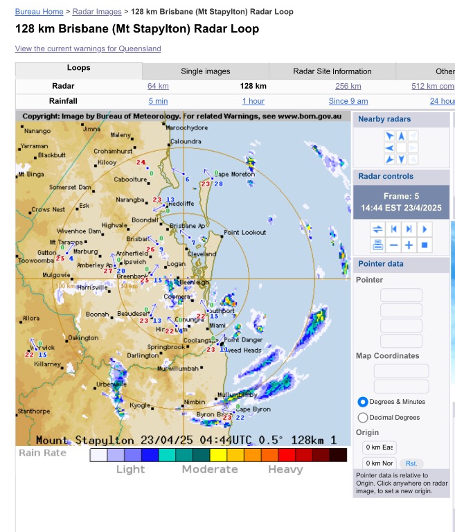 It did feel like we had a little blast of summer to end the school holidays  The kids certainly enjoyed a bit of extra beach and pool time in the warmer weather. A very heavy rainfall on Monday night brought an interesting end to the long weekend. As Colmait mentioned above it looks like we are in for a showery end to the week. The BOM forecast for Brisbane for the next few days:  Edited by user Wednesday, 23 April 2025 8:35:31 PM(UTC)